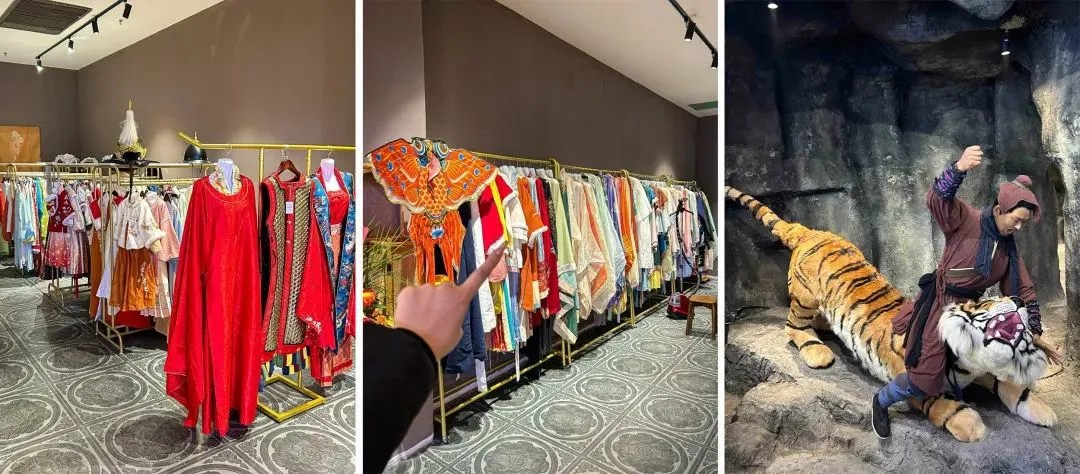 宋朝食間的另一大亮點(diǎn)是漢服體驗(yàn)館(需付費(fèi))。除了提供宋朝傳統(tǒng)的男子常服襕衫、女子襦裙款式,也有不少經(jīng)過改良的“新中式”款式。換上古裝后,可以到多個(gè)拍照點(diǎn)位打卡,如武松打虎、魯提轄倒拔垂柳等經(jīng)典場景,還可以到大舞臺(tái),看各式文藝表演。