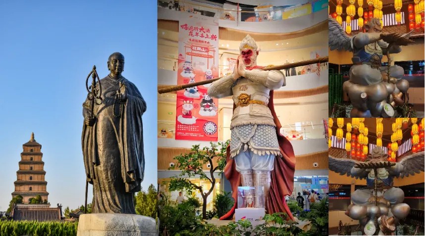 以西安大悅城為例,他深挖大唐、長安歷史文化底蘊,與在地城市地標(biāo)形成呼應(yīng),中庭悟空與大雁塔玄奘雕像隔街對望,并打造契合潮流時尚客群訴求的“勿空”美食街區(qū)與“不戒食巷”,街區(qū)內(nèi)的墻體上還有師徒四人取經(jīng)歸來的立體壁畫,讓原本只以美陳形式存在的孫悟空、豬八戒變成文化傳播的紐帶。